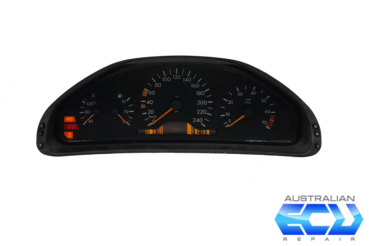 We can repair your faulty Mercedes-Benz W202 C class instrument cluster. This instrument cluster commonly suffers a total failure with no lights or gauges functioning anymore and loss of CAN communication with other modules. It is also common for the LCD displays on this model to fail become disfigured eventually becoming permanently blank. We can also repair most other issues with this instrument cluster. All repairs comes with a 12 month warranty.